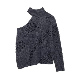 Grey Beaded Cut-Out Shoulder Knit Sweater
